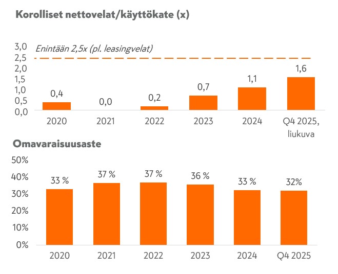 Korolliset nettovelat/käyttökate ilman IFRS 16 vaikutusta, liukuva 12 kk |
