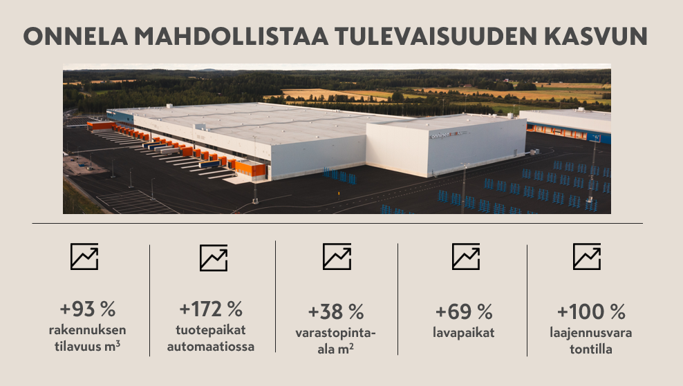 Sijoittajanäkökulmasta satsaus suurempaan ja modernimpaan teknisen kaupan varastoon on tärkeä. Onnisen liiketoiminta Suomessa on kasvanut merkittävästi sen jälkeen, kun Kesko osti yhtiön vuonna 2016. Kun rakentamisen suhdanne viimeksi oli korkeimmillaan, logistiikka muodostui ajoittain pullonkaulaksi Onnisen toimituksille. Onnelan ansiosta vastaavaa ei enää pääse tapahtumaan, kun rakentaminen lähtee taas kunnolla käyntiin.