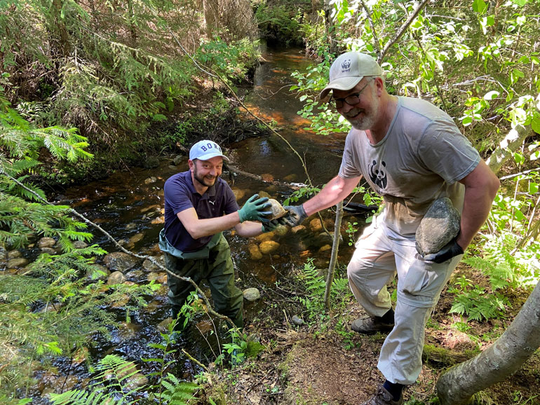 Imatran K-Citymarket-kauppias Marko Tujula (kuvassa vasemmalla) oli jo toistamiseen mukana K-Kalapolut-talkoissa. Kivien kantaminen joenuomaan sujui hyvässä yhteistyössä WWF:n suojelujohtaja Jari Luukkosen kanssa.
